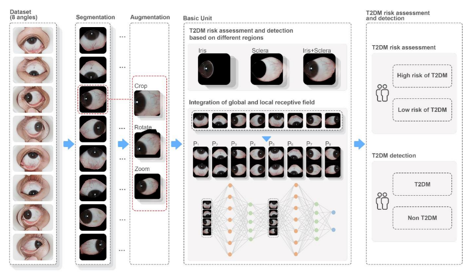 隨著人們生活節(jié)奏的加快,糖尿病越來越普遍,很多人都不知道自己是否患有這種疾病。中醫(yī)認(rèn)為眼睛表面的特征與糖尿病的風(fēng)險水平之間有關(guān)聯(lián)關(guān)系,這為糖尿病篩查提供了新思路。該研究構(gòu)建了基于深度學(xué)習(xí)的眼表圖像評估2型糖尿?。╰ype 2 diabetes, T2DM)風(fēng)險模型OcularSurfaceNet。該模型可以作為一種使用簡便、低成本、無創(chuàng)的工具,促進(jìn)大規(guī)模人群糖尿病篩查和預(yù)防。