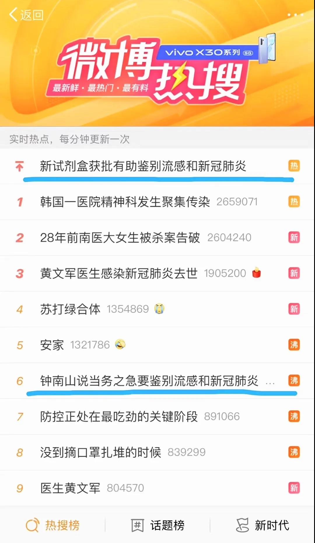 該消息一經(jīng)發(fā)布,新試劑盒獲批有助鑒別流感和新冠肺炎迅速?zèng)_上了微博熱搜,霸屏各大媒體和微博。
