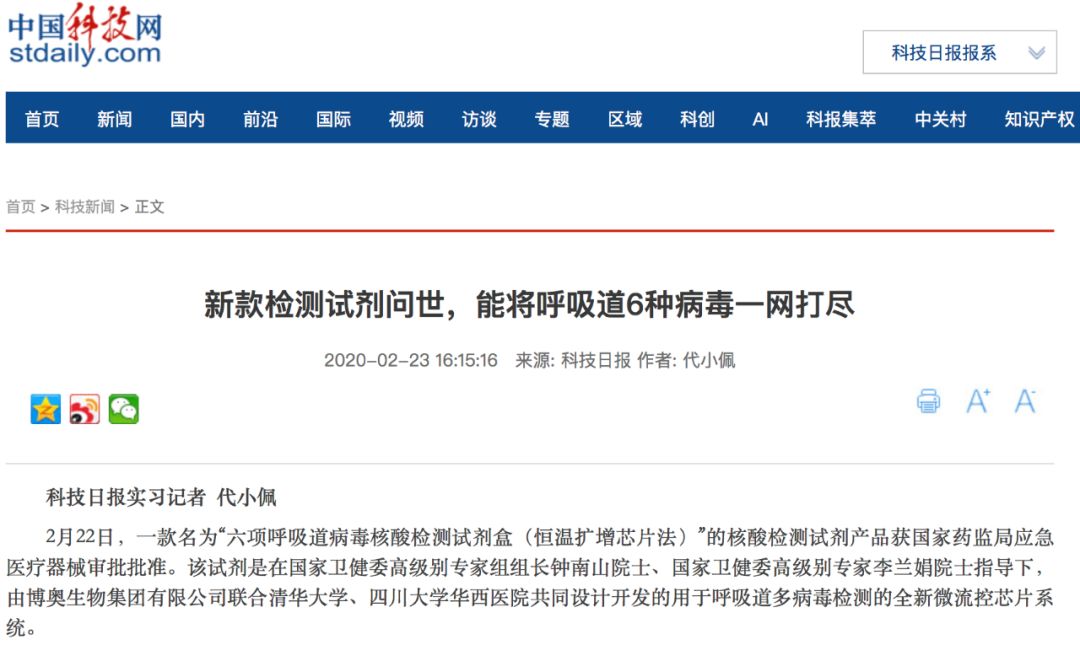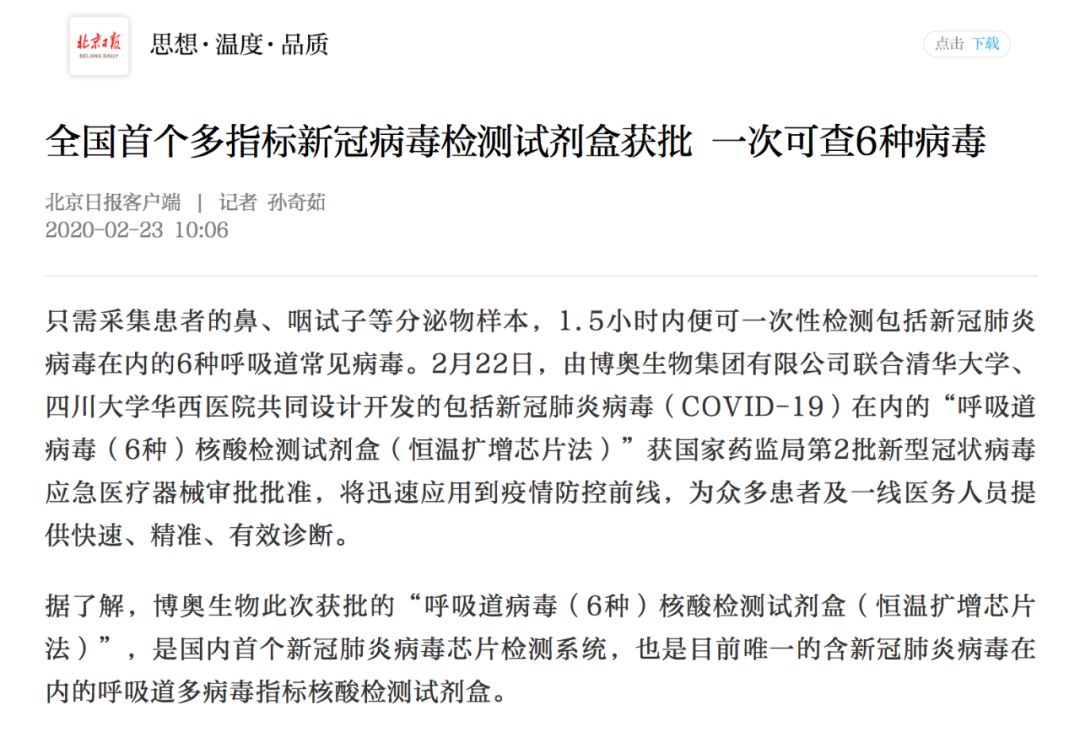 2月22日,由博奧生物集團(tuán)有限公司聯(lián)合清華大學(xué)、四川大學(xué)華西醫(yī)院共同設(shè)計(jì)開發(fā)的包括新型冠狀病毒(2019-nCoV)在內(nèi)的“六項(xiàng)呼吸道病毒核酸檢測(cè)試劑盒(恒溫?cái)U(kuò)增芯片法)”獲國(guó)家藥監(jiān)局新型冠狀病毒應(yīng)急醫(yī)療器械審批批準(zhǔn)(注冊(cè)證編號(hào):國(guó)械注準(zhǔn)20203400178),將迅速應(yīng)用到疫情防控前線,為眾多患者及一線醫(yī)務(wù)人員提供快速、精準(zhǔn)、有效的診斷。